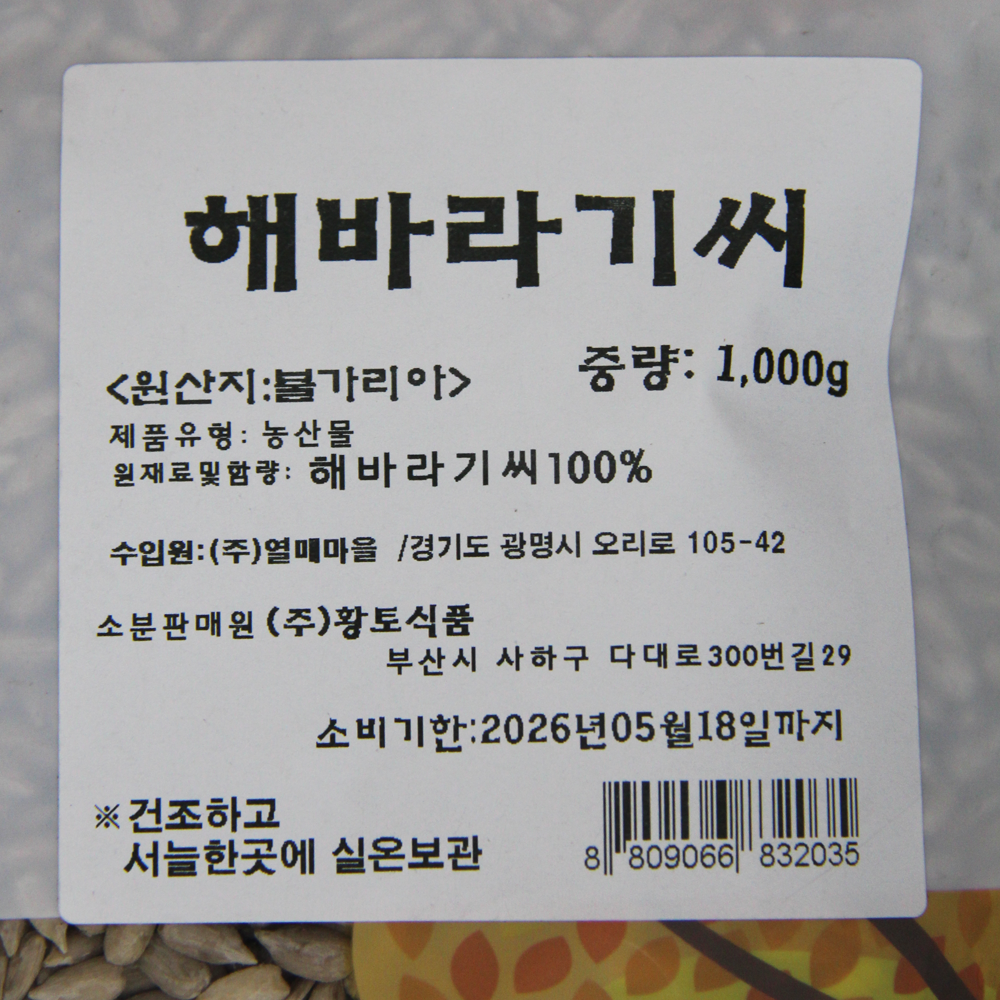 | 원재료명 및 함량(농수산물의 원산지 표시에 관한 법률에 따른 원산지 표시 포함) | 해바라기씨100% |