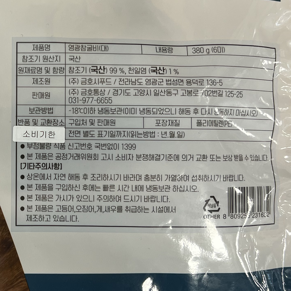 | 품목 또는 명칭 | 섭간한 영광참굴비(6미·대) 380G/금호통상 |