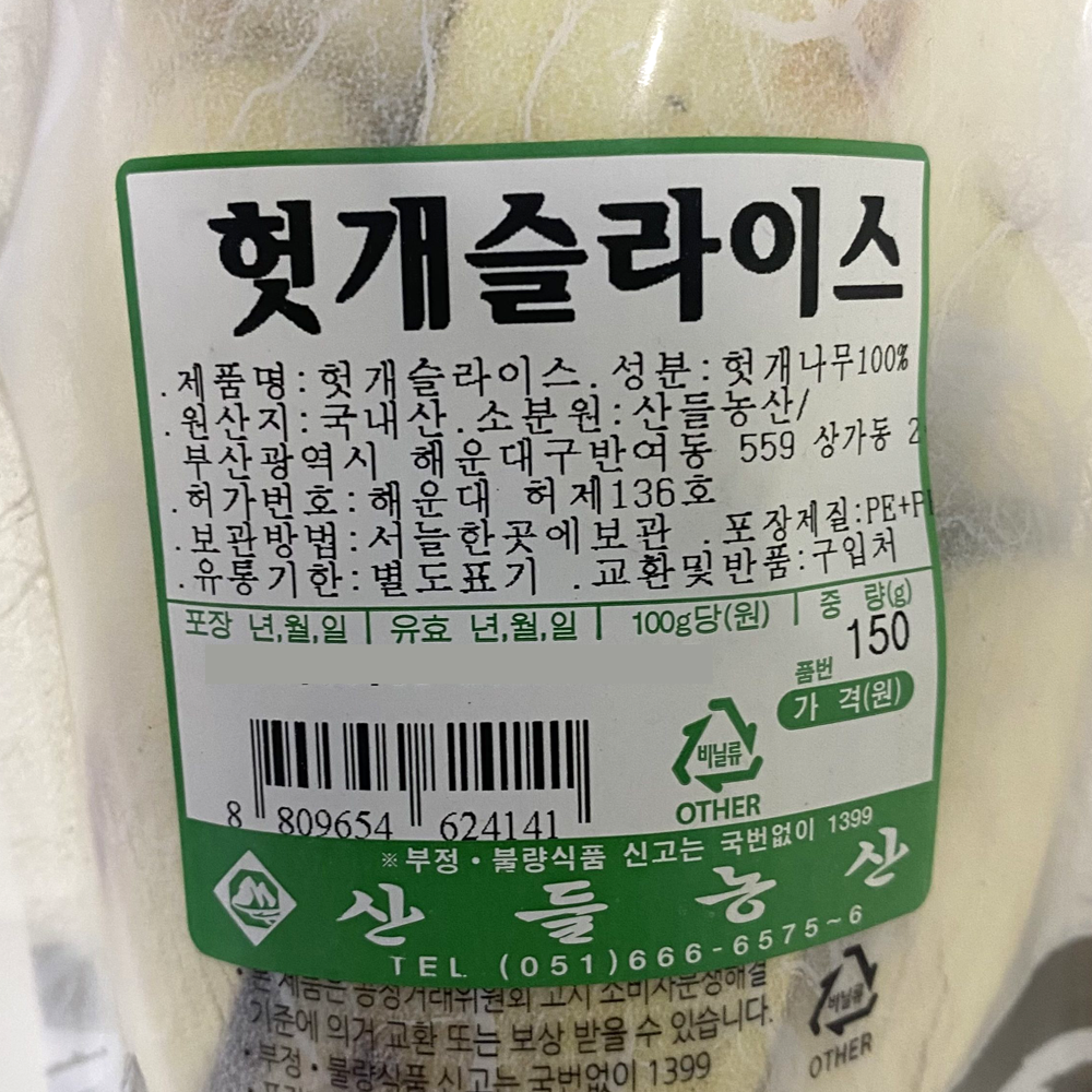 | 품목 또는 명칭 | 헛개나무 슬라이스·150g(국내산)/산들농산 |