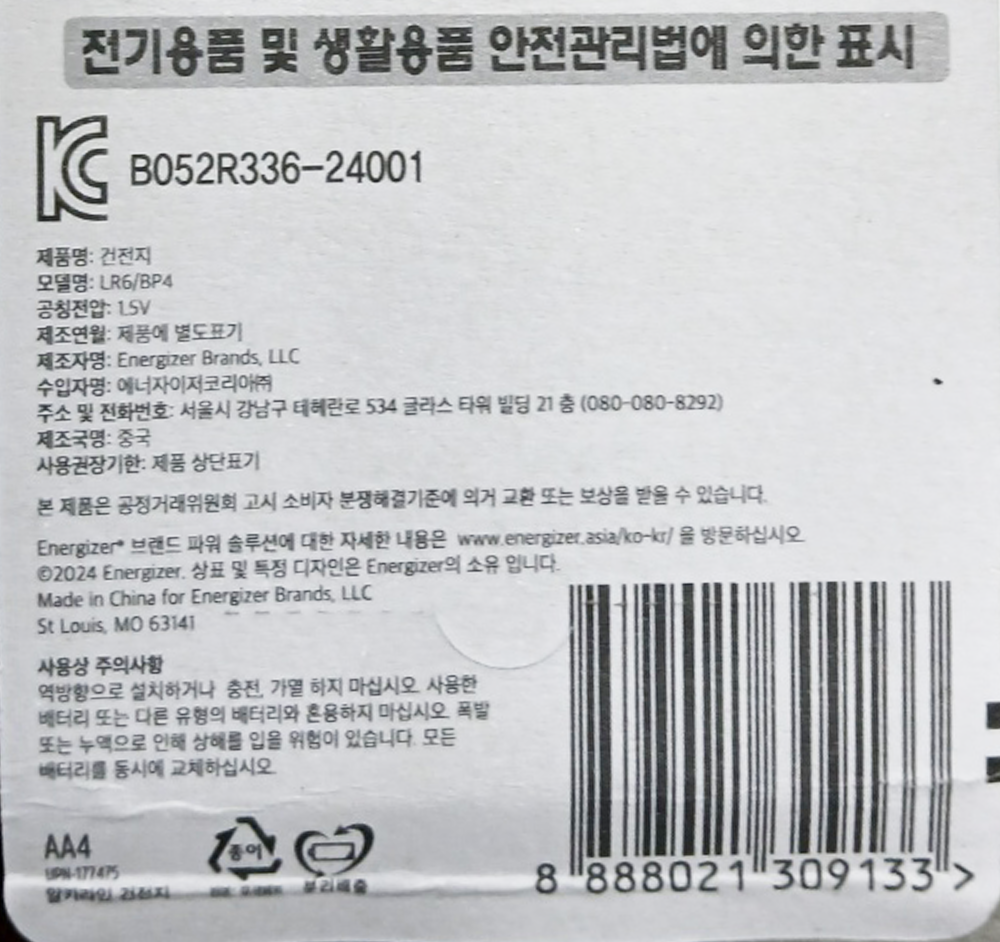 | 제품명 | NEW 에너자이저 AA 4P /알카라인건전지 |