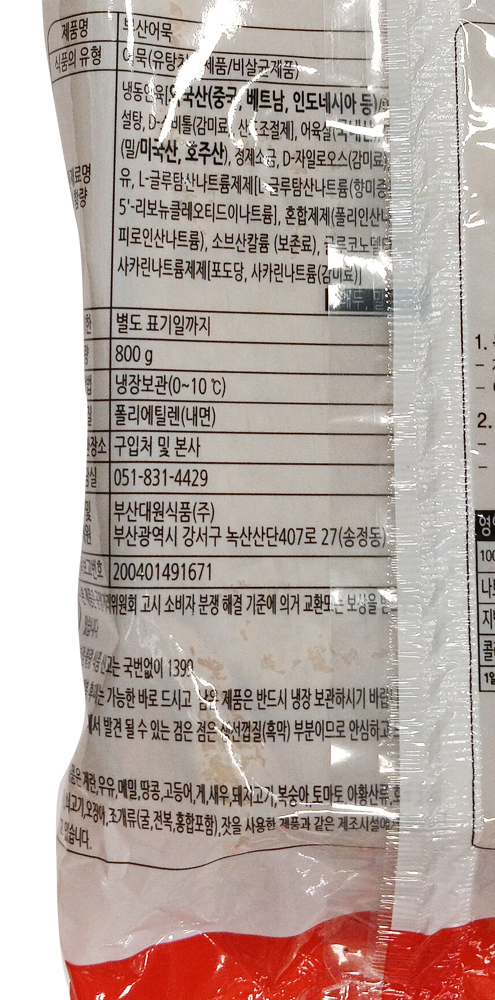 | 식품의 유형 | 어묵(유탕처리제품/ 비살균제품) |