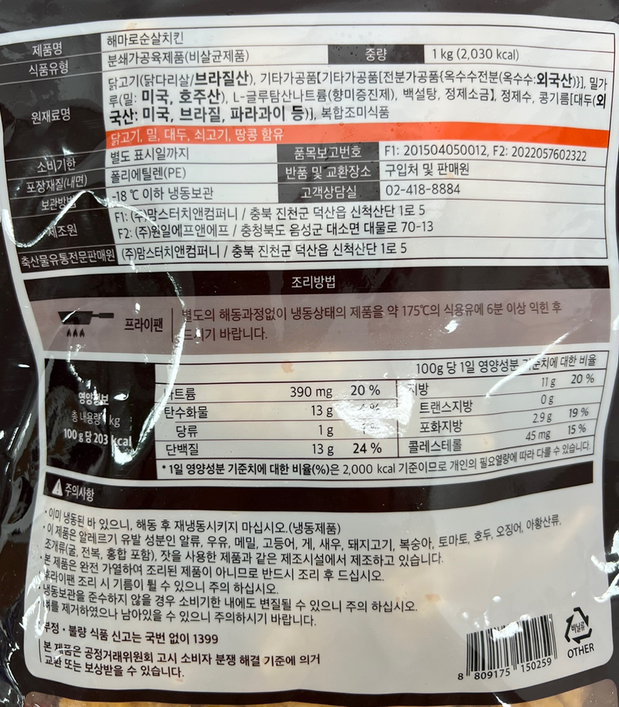 | 원재료명 및 함량(농수산물의 원산지 표시에 관한 법률에 따른 원산지 표시 포함) | 닭고기 70% (닭다리살/브라질산) |
