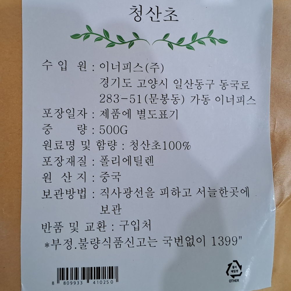 | 원재료명 및 함량(농수산물의 원산지 표시에 관한 법률에 따른 원산지 표시 포함) | 청산초 100% |
