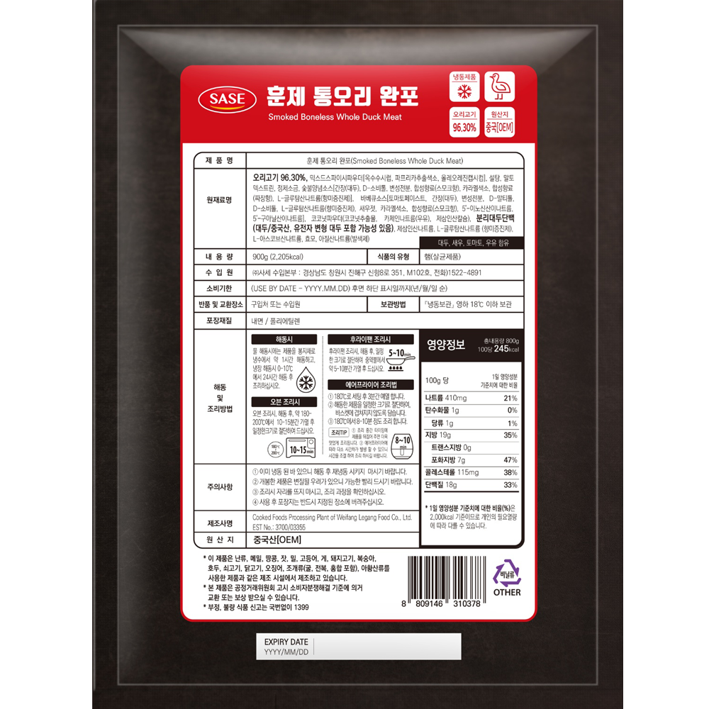 | 제품명 | 훈제 통오리완포 900g(냉동)/사세 |