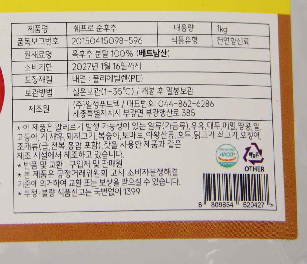 | 제품명 | 쉐프로 순후추 1kg (순도100%)/일성푸드텍 |
