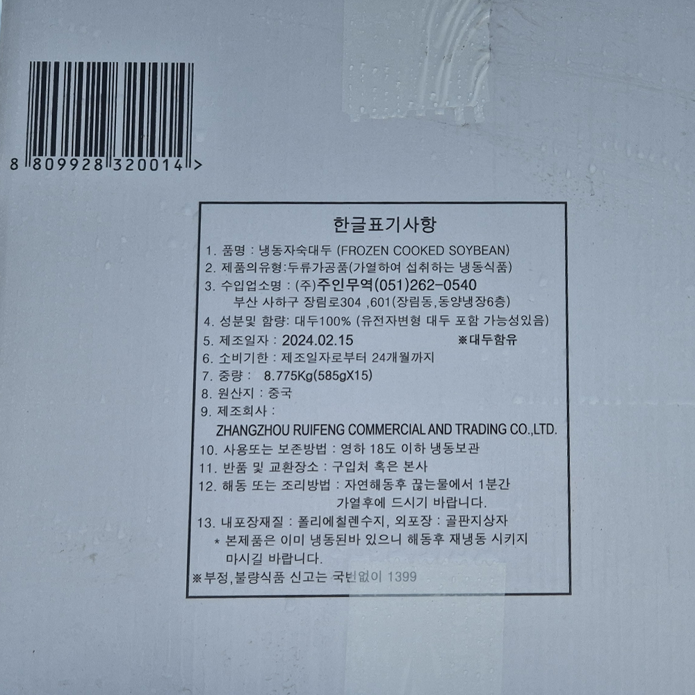 | 품목 또는 명칭 | 냉동 자숙대두·585g(중국산)/주인무역 |