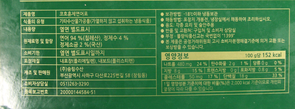 | 품목 또는 명칭 | 코호 훈제 연어포(5-7미) 9.5kg/송림수산 |
