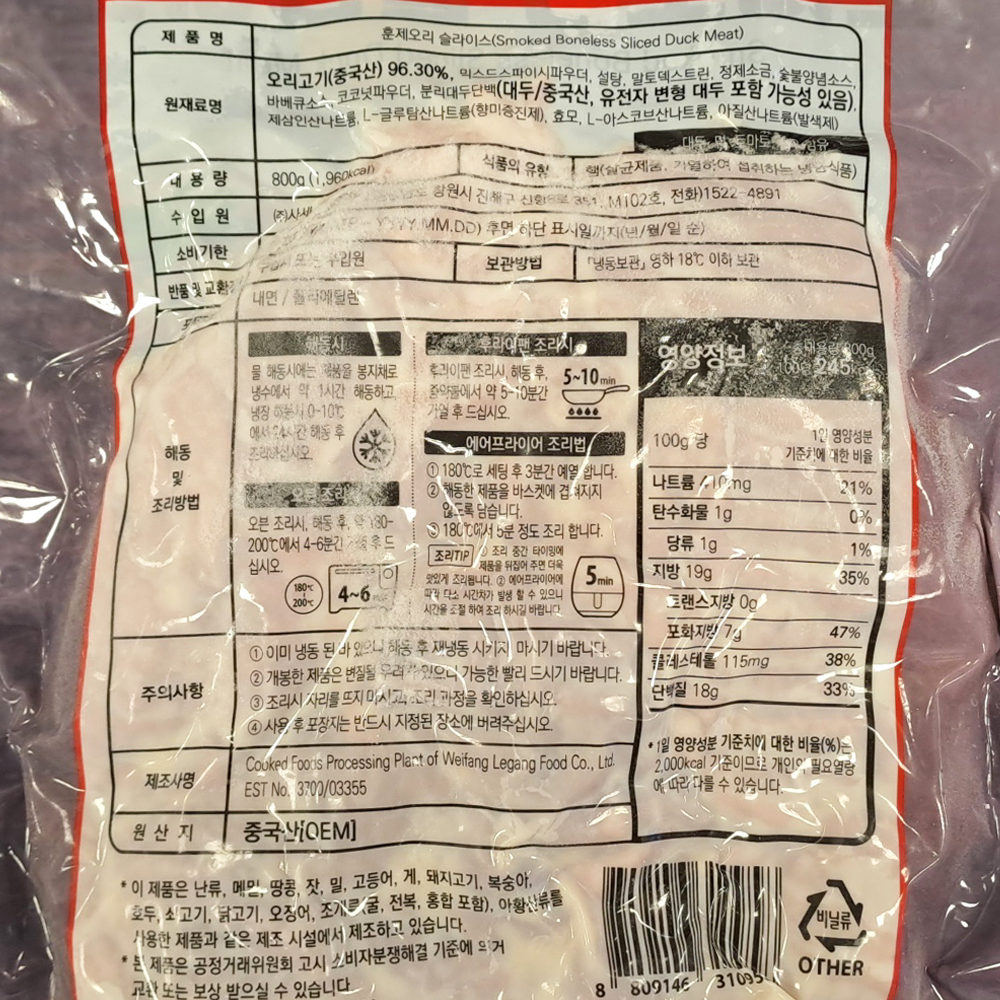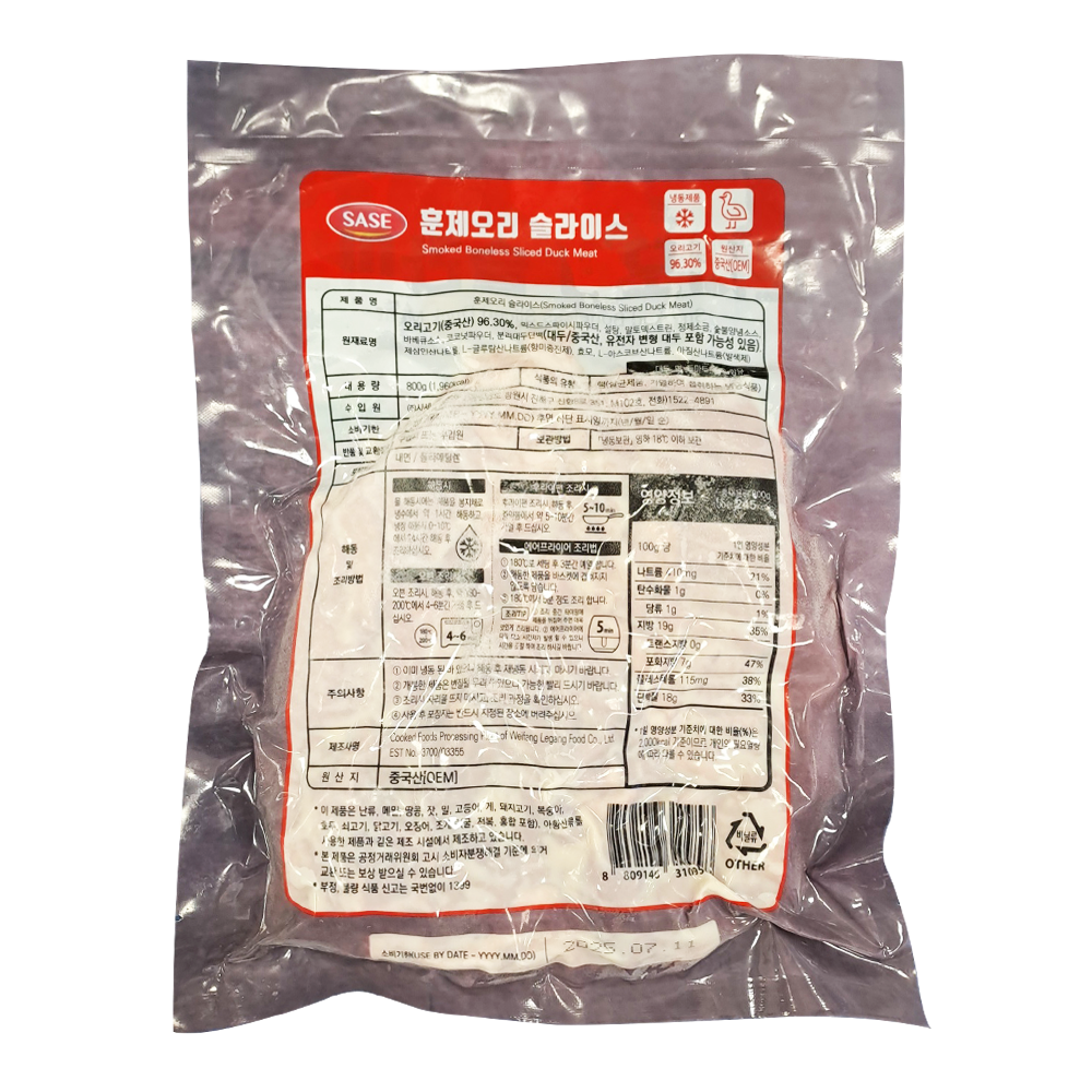 | 제품명 | 냉동 훈제오리 S/L 800g (중국산)/사세 |