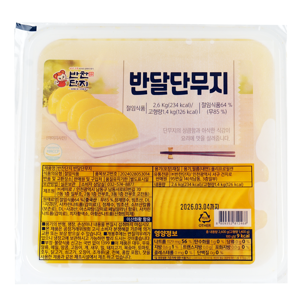 | 제품명 | 반찬단지 반달단무지 2.6kg/세미로 |