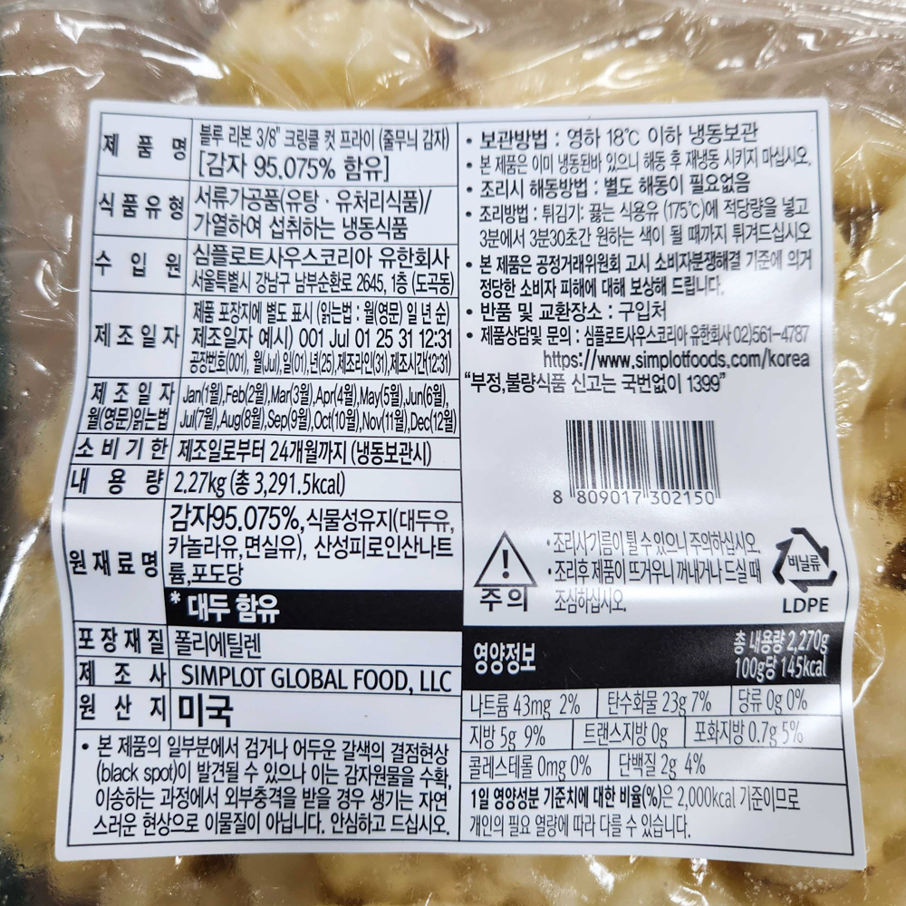 | 제품명 | 블루리본 3/8″ 크링클컷 프라이 2.27kg/심플로트 |