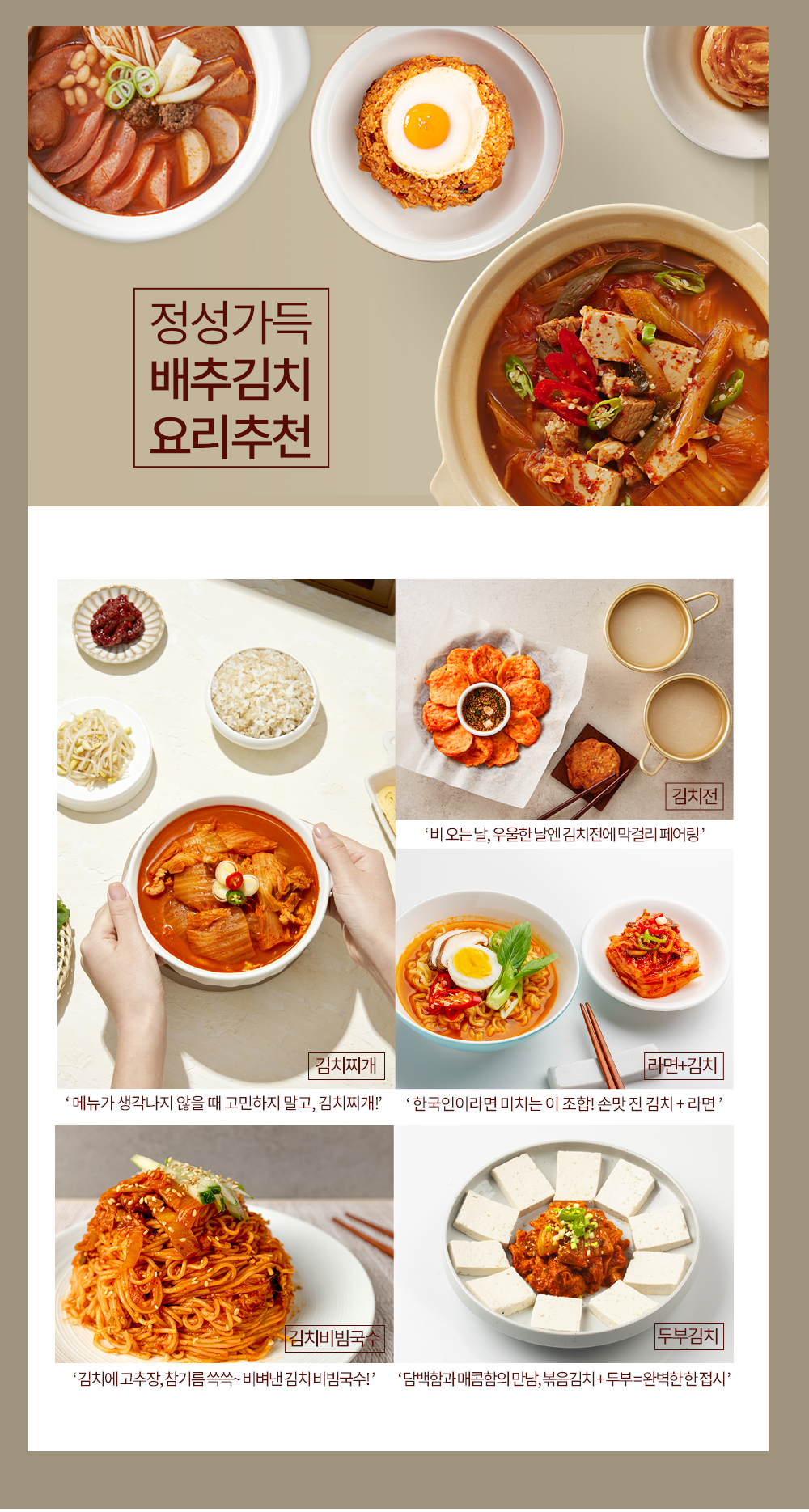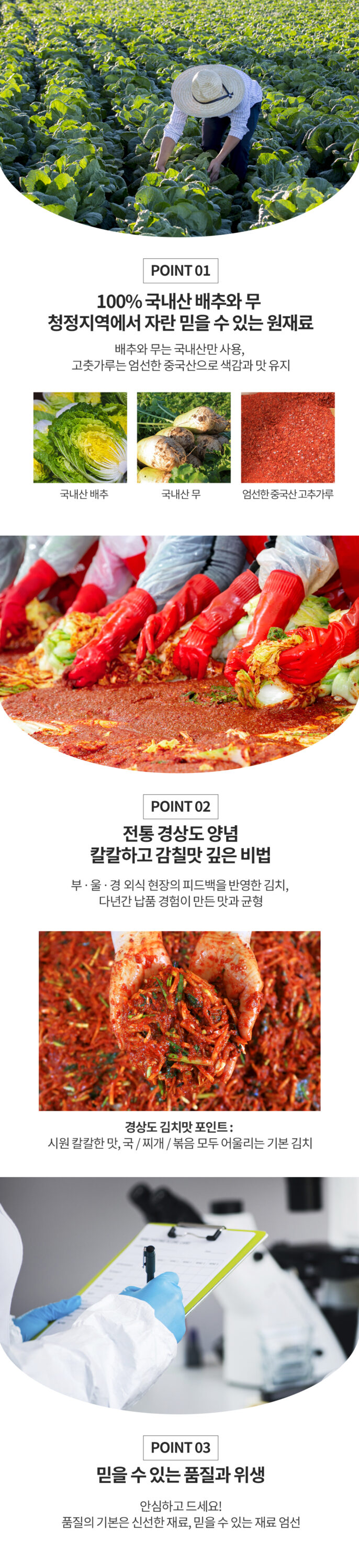| 원재료명 및 함량(농수산물의 원산지 표시에 관한 법률에 따른 원산지 표시 포함) | 배추 73%(국산),무 7%(국산),정제소금 2%(국산),고춧가루 8%(중국산),마늘,양파,생강,멸치액젓,새우젓,설탕,대파,L-글루탐산나트륨,호화쌀가루 |