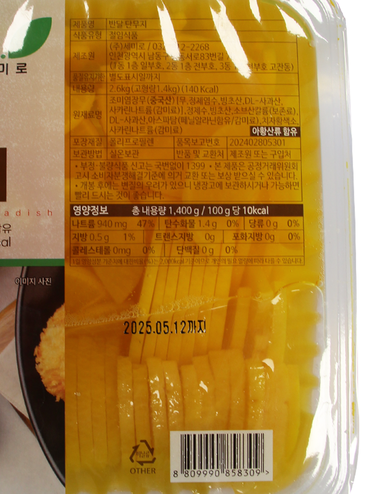 | 제품명 | 반달단무지 2.6kg/세미로 |