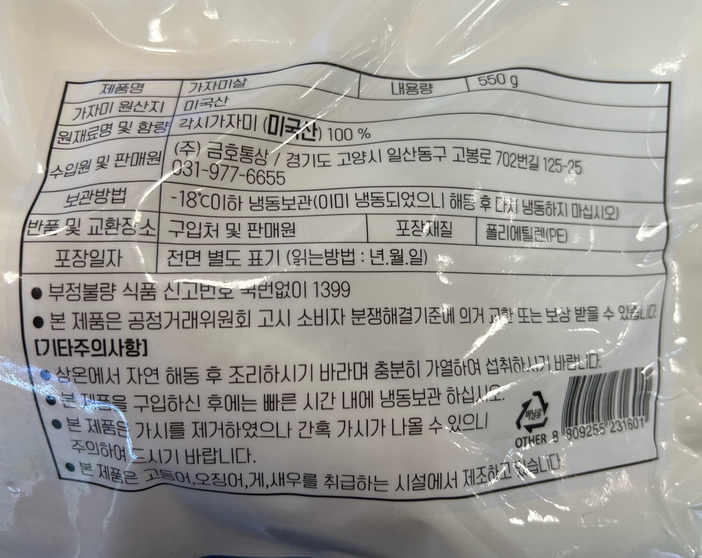 | 품목 또는 명칭 | 가자미살 550g(미국산)/금호통상 |