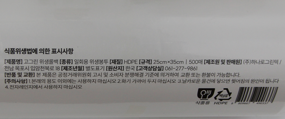 | 제품명 | 고그린 위생롤백 25*35 (500매) /하나로그린텍 |