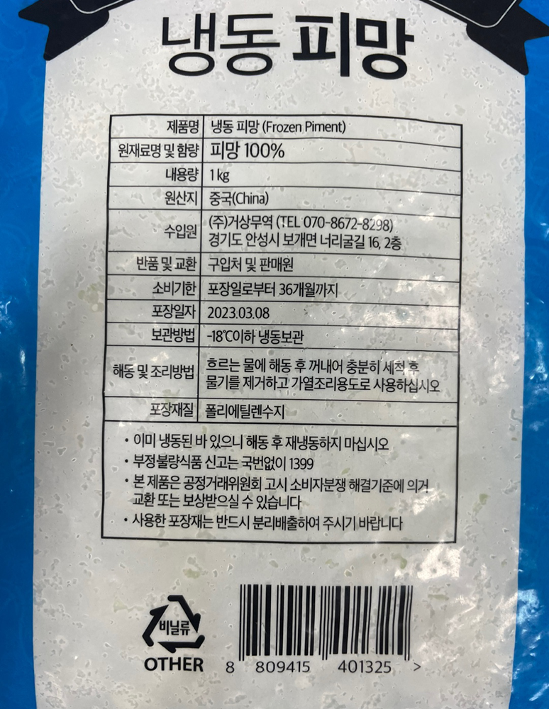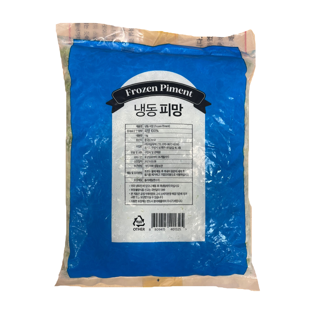 | 품목 또는 명칭 | 냉동 청피망·1kg /중국산 |