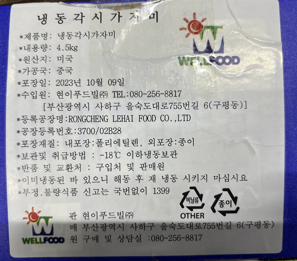 | 보관방법 또는 취급방법 | 보관시 주의사항:냉동 -18℃ 이하 |