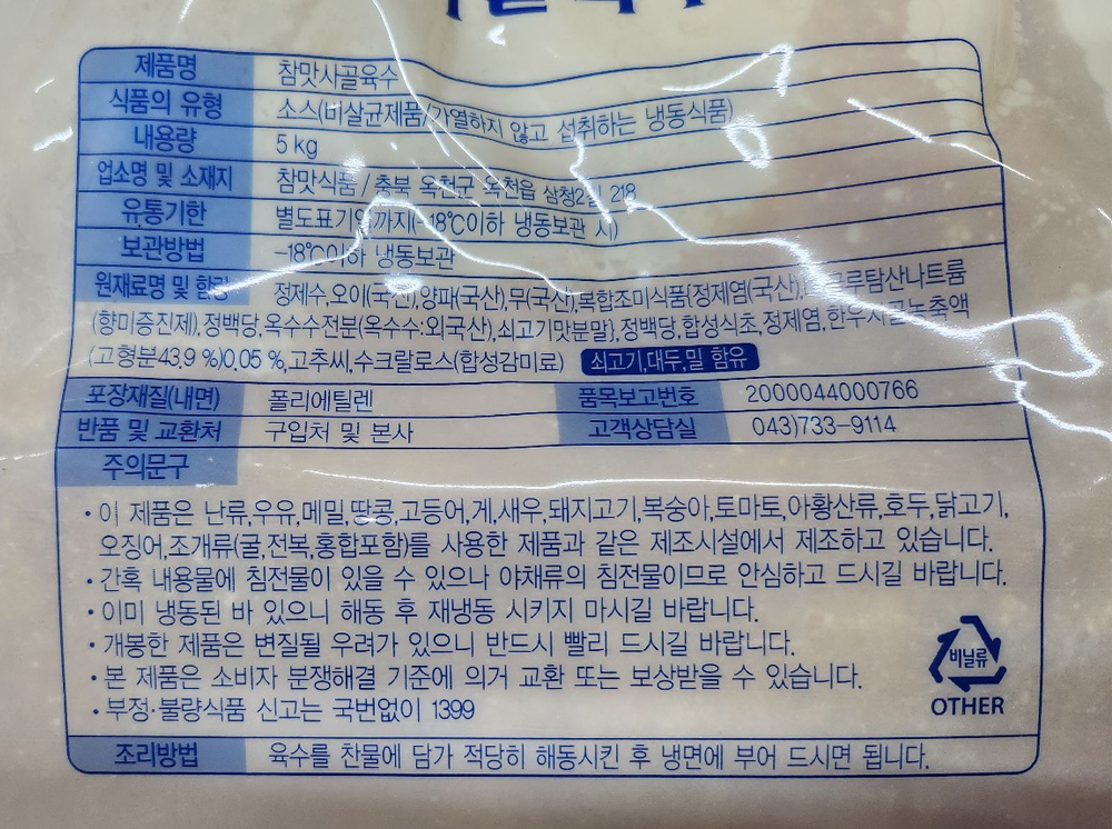 | 제품명 | 냉동 참맛 사골육수 5kg/참맛식품 |