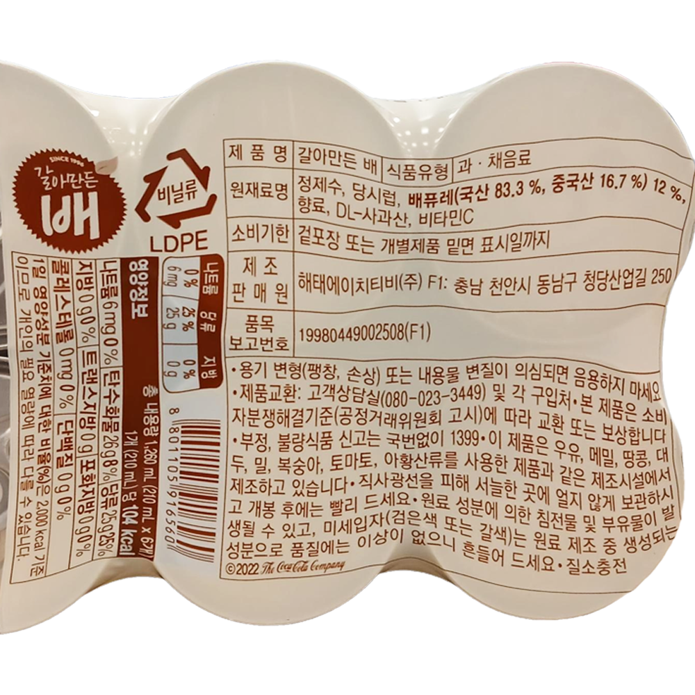 | 제품명 | 갈아만든 배 210ml×6캔 /해태htb |