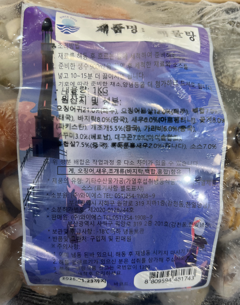 | 품목 또는 명칭 | 냉동 해물탕 1kg (양념포함)/와이에스 |