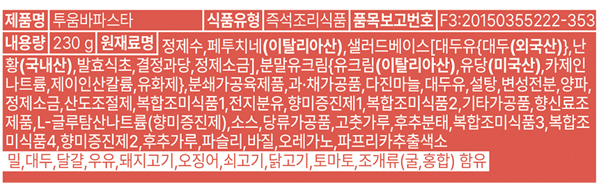| 원재료명 및 함량(농수산물의 원산지 표시에 관한 법률에 따른 원산지 표시 포함) | 정제수,페투치네(이탈리아산),샐러드베이스[대두유{대두(외국산)},난황(국내산),발효식초,결정과당,정제소금],분말유크림{유크림(이탈리아산),유당(미국산),카제인나트륨,제이인산칼륨,유화제},분쇄가공육제품,과채가공품,다진마늘,대두유,설탕,변성전분,양파,정제소금,산도조절제,복합조미식품1,전지분유,향미증진제1,복합조미식품2,기타가공품,향신료조제품,L-글루탐산나트륨(...등 상세설명참조 |