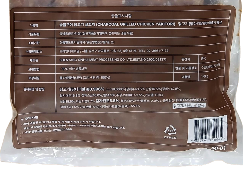| 생산자 및 소재지(수입품의 경우 생산자, 수입자 및 제조국) | 원산지 : 중국산 수입원 : 화만무역 / 서울특별시 강서구 화곡로42가길 5-11 801호 제조사 : LIAONING FUXING FOODS CO.LTD |