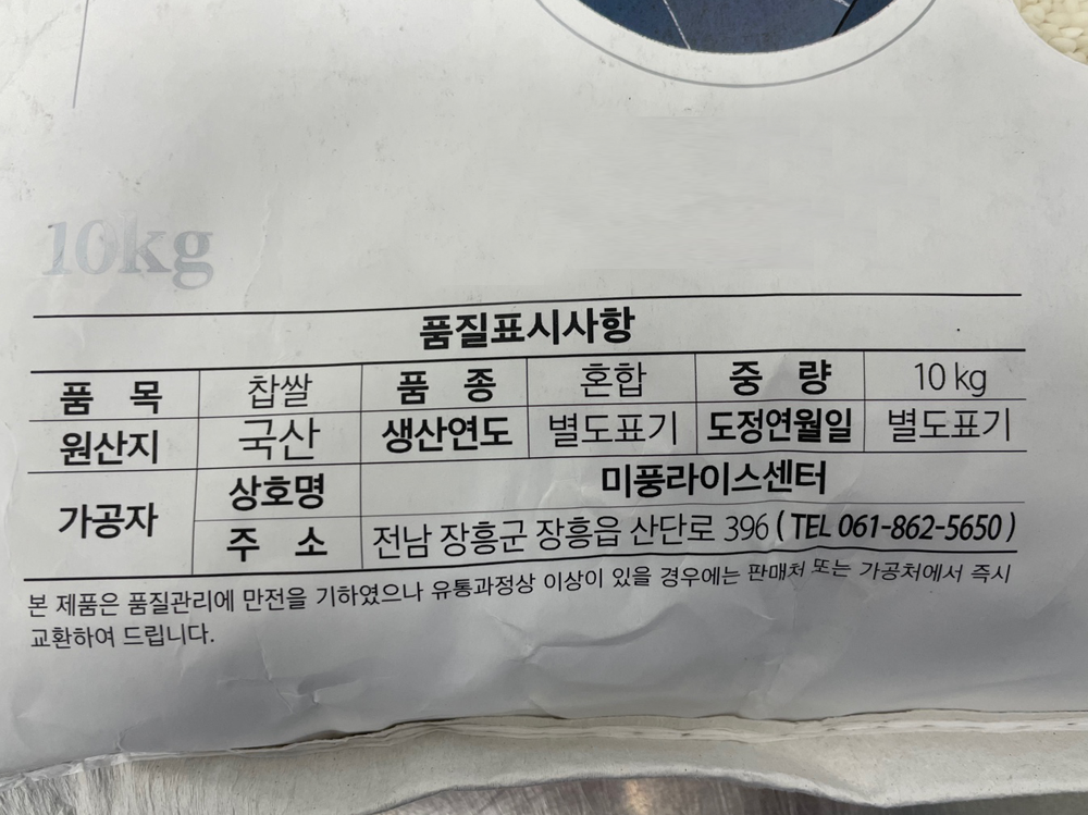 | 품목 또는 명칭 | 찹쌀·10kg/미풍라이스 |