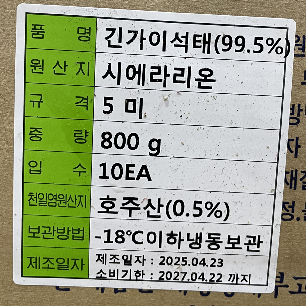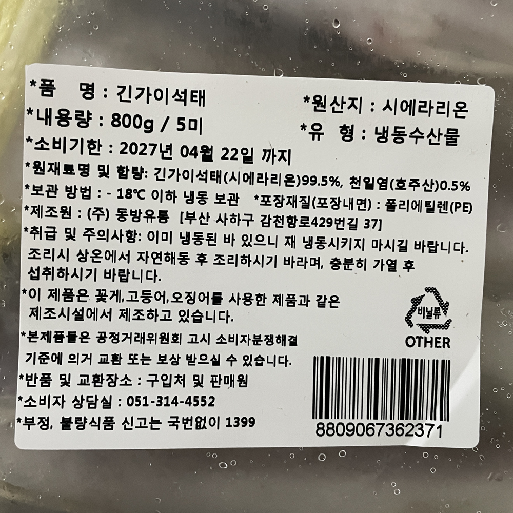 | 품목 또는 명칭 | 냉동 긴가이석태 (5미) 약800g/시에라리온 |