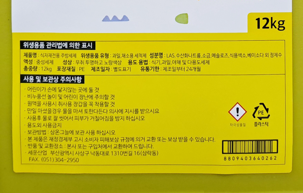 | 제품명 | 식자재전용 주방세제·1종 12kg/세운산업 |