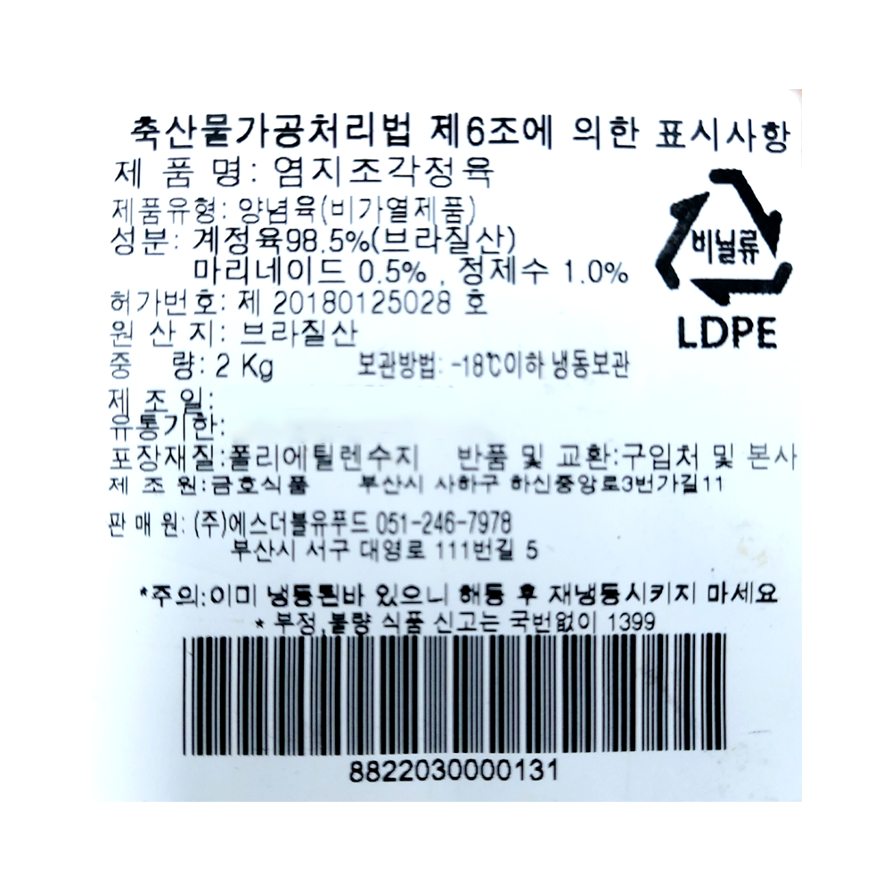 | 품목 또는 명칭 | 염지 조각닭정육 2kg(브라질산)/SW푸드 |