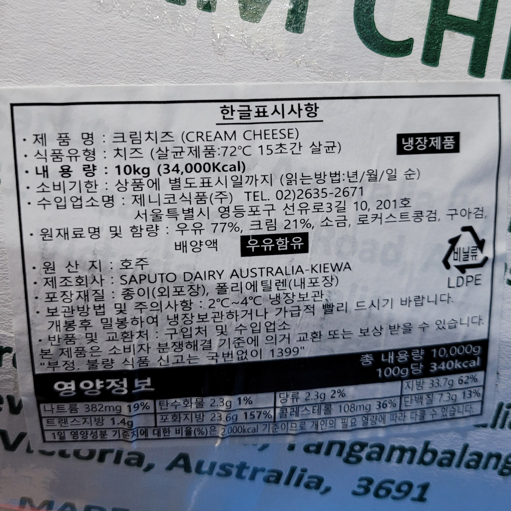 | 제품명 | 워넘블 크림치즈 10kg/호주산 |