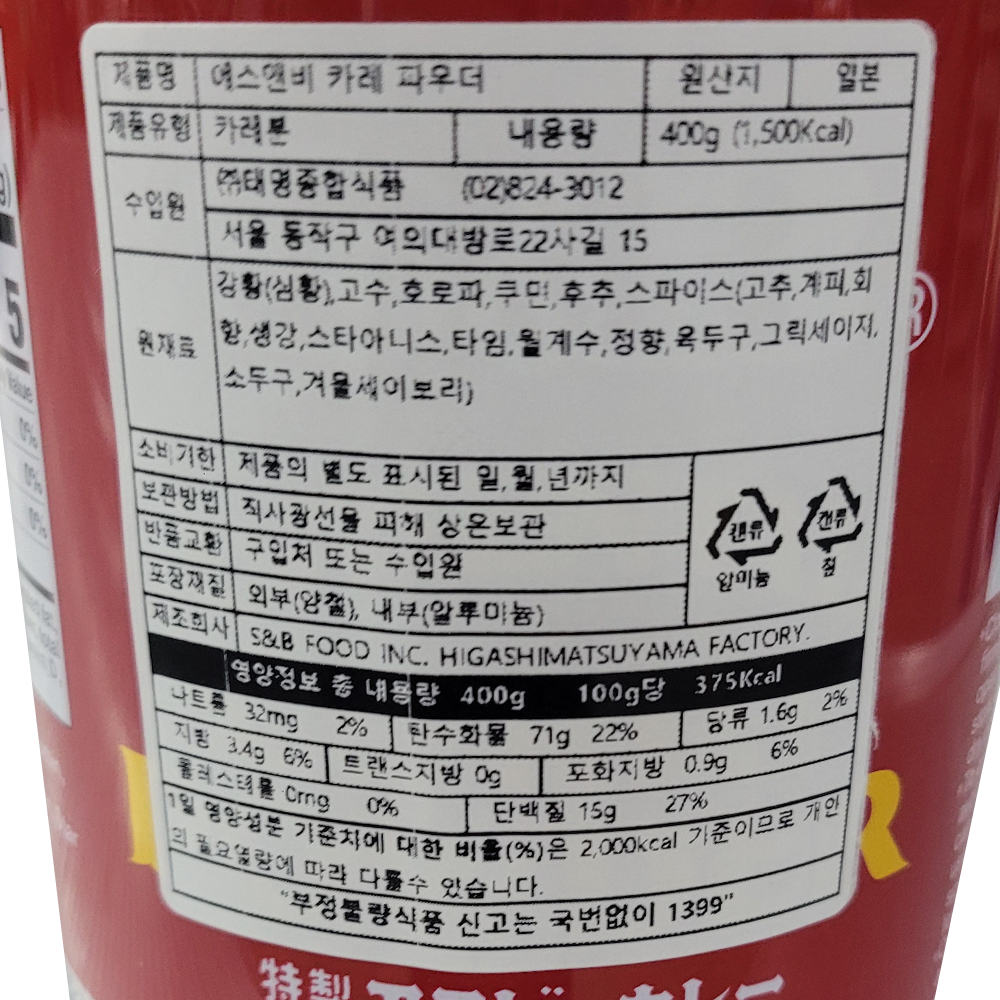 | 제품명 | 에스엔비 카레파우더 400g/S&B |