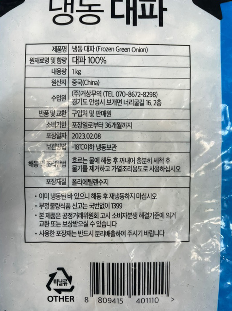 | 품목 또는 명칭 | 냉동 대파·1kg/중국산 |