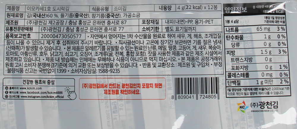 | 제품명 | 이모카세1호 도시락김(4g*12봉) /광천김 |