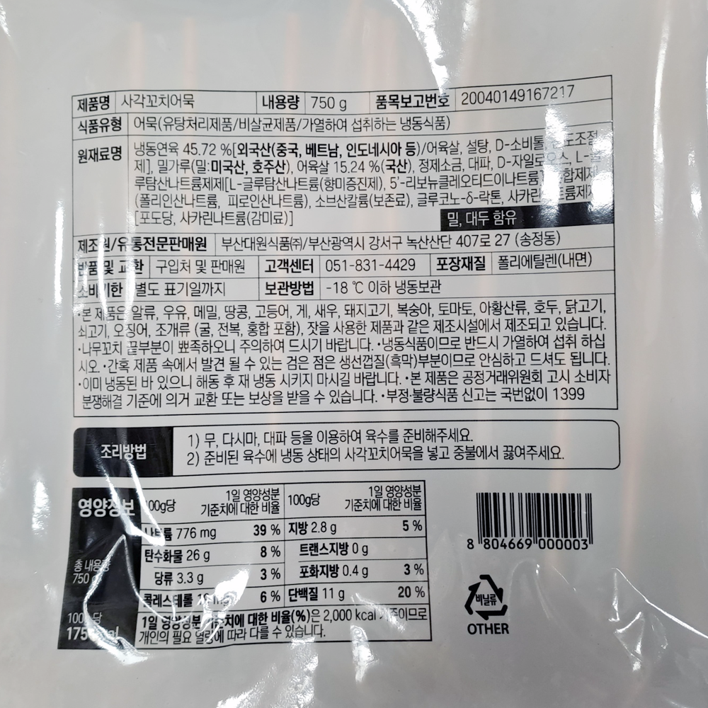 | 원재료명 및 함량(농수산물의 원산지 표시에 관한 법률에 따른 원산지 표시 포함) | 냉동연육45.72%(외국산/어육살,설탕,D-소비톨,산도조절제),어육살 15.24%(국산), 밀가루(밀/미국산,호주산)등 |