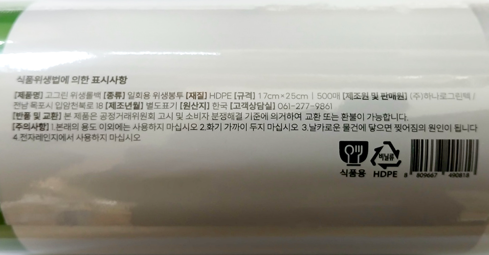 | 제품명 | 고그린 위생롤백 17*25 (500매) /하나로그린텍 |