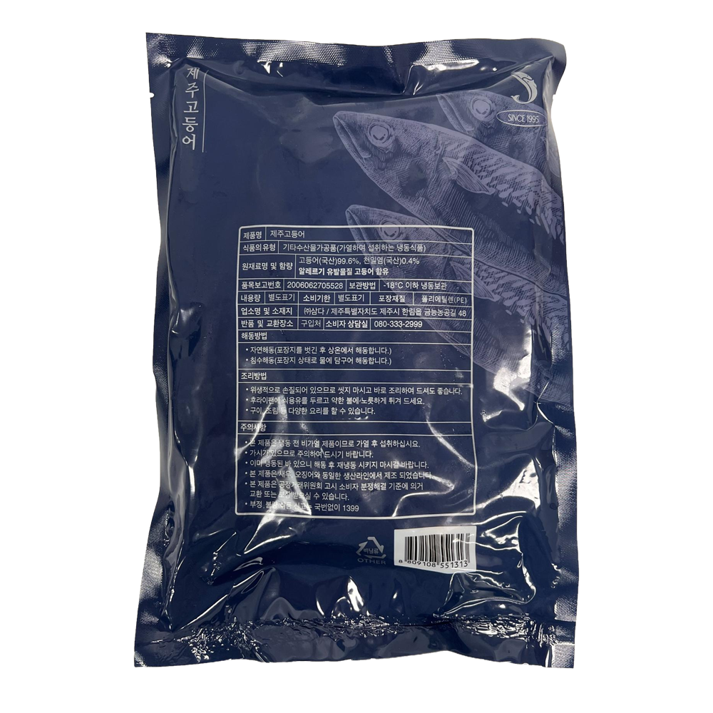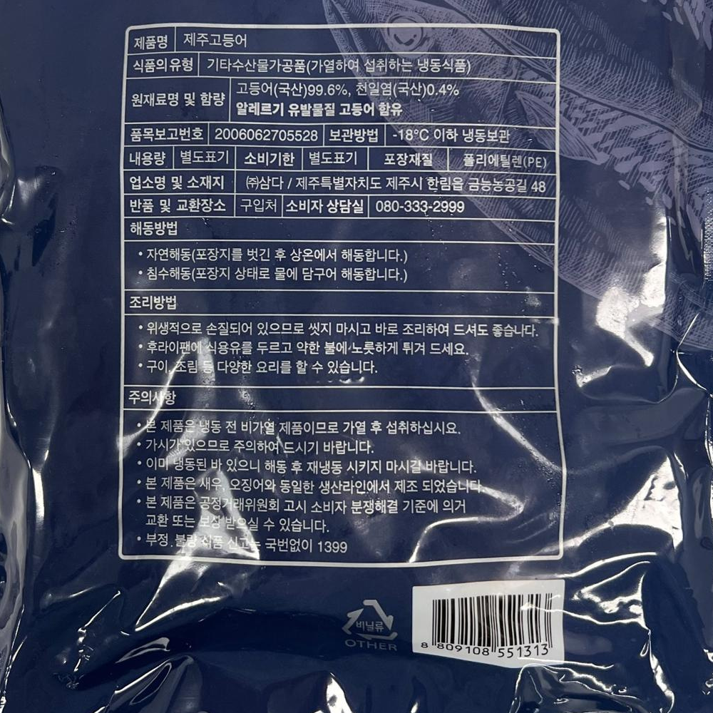 | 품목 또는 명칭 | 제주고등어(개별포장) 500g/삼다 |