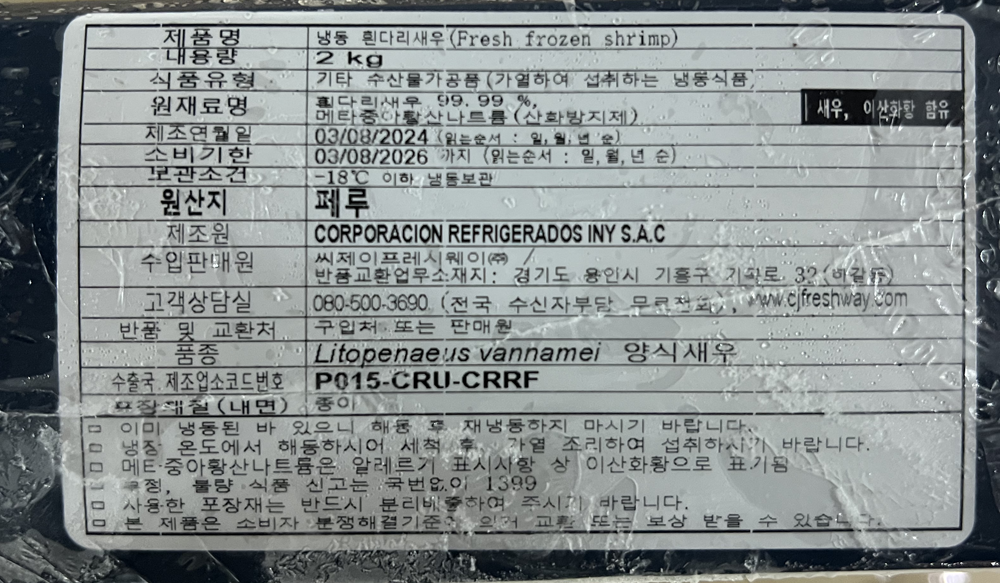 | 품목 또는 명칭 | 냉동흰다리새우HOSO 2kg(60/70)/나인수산 |