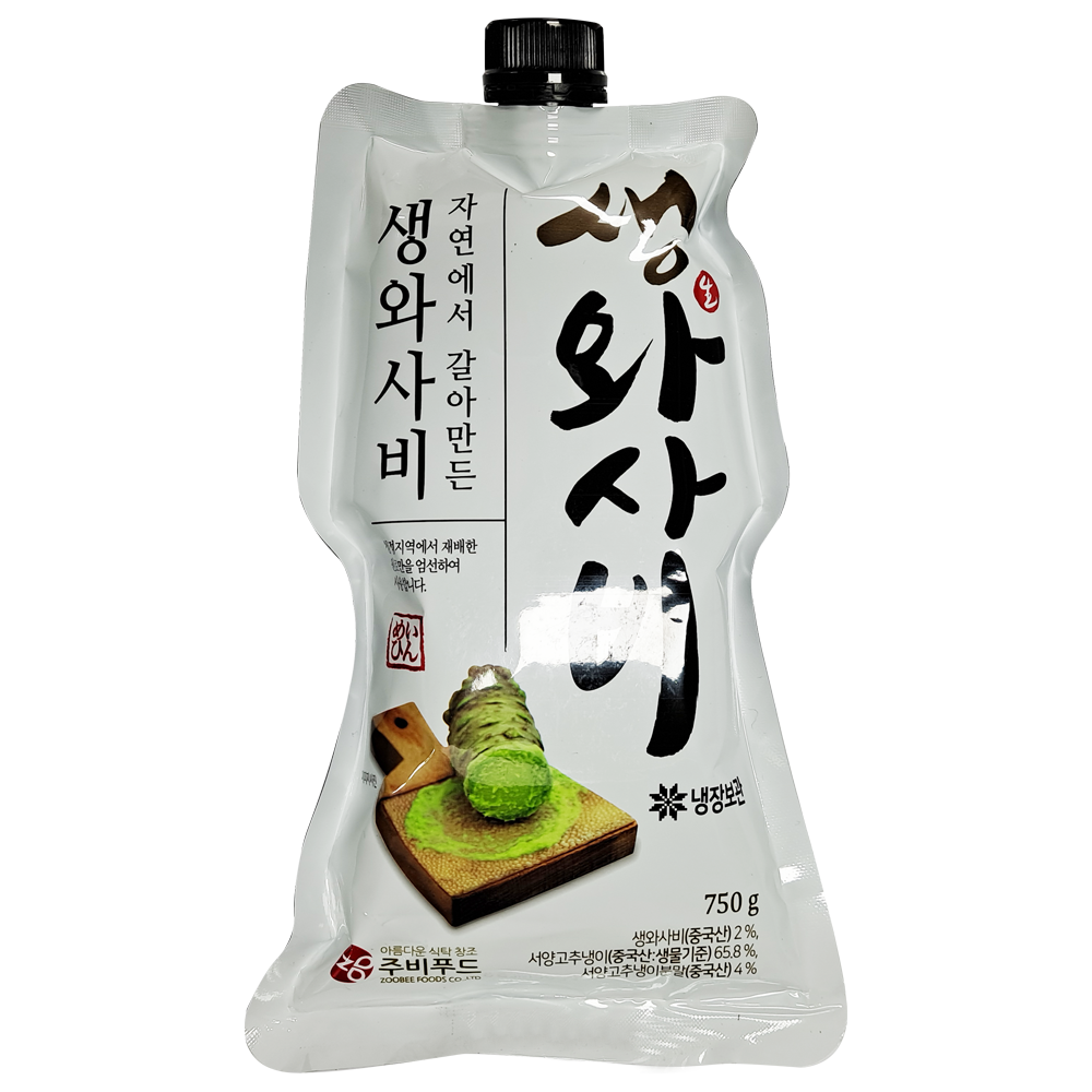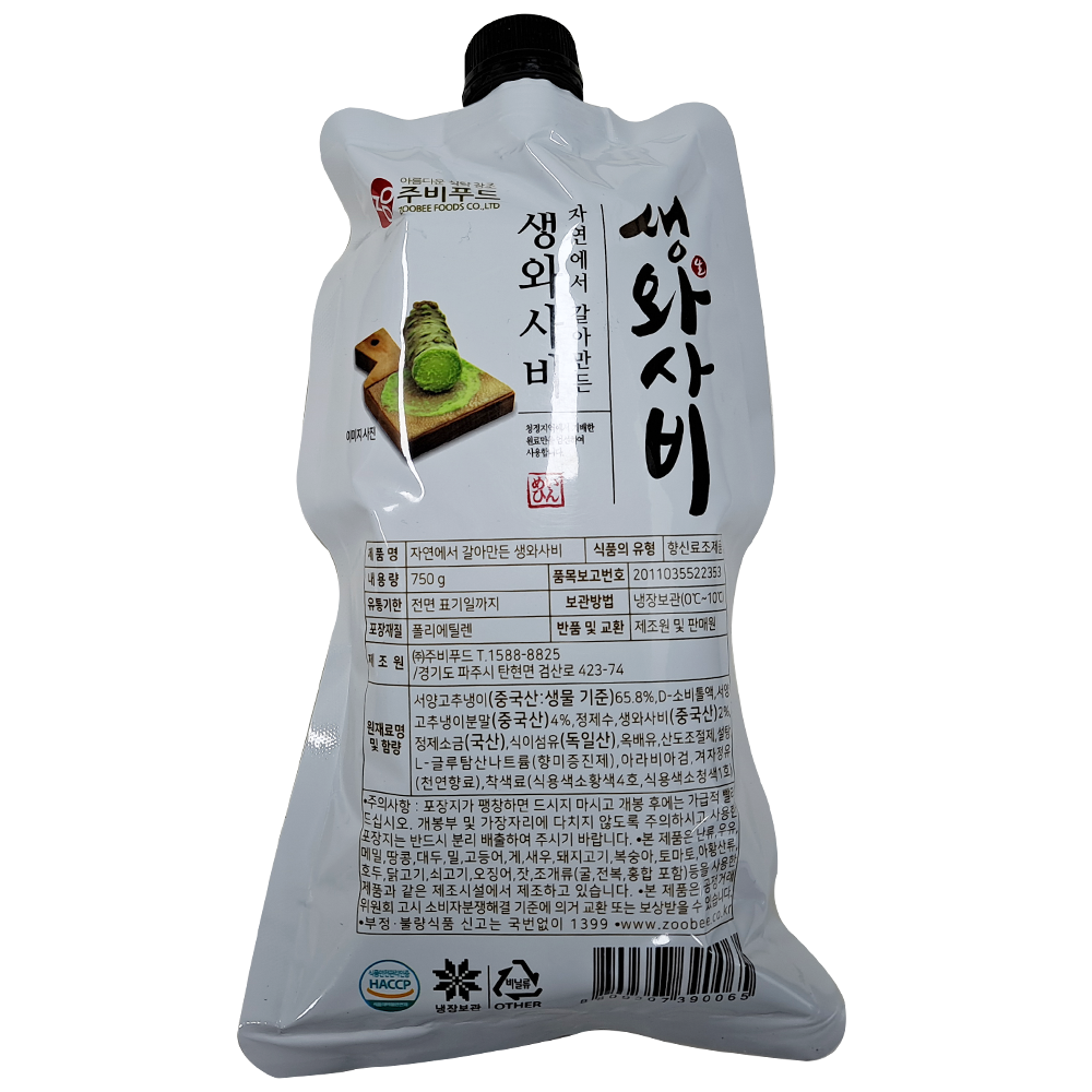 | 원재료명 및 함량(농수산물의 원산지 표시에 관한 법률에 따른 원산지 표시 포함) | 서양고추냉이(중국산:생물기준) 65.8%, D-소비톨액,서양고추냉이분말(중국산)4%, 정제수, 생와사비(중국산)2%, 정제소금(국산), 식이섬유(독일산),옥배유,산도조절제등 |