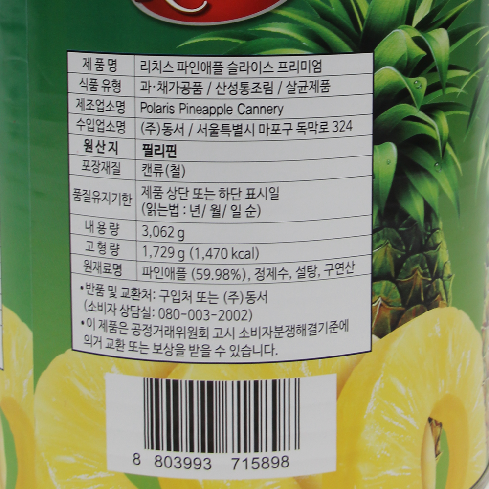 | 제품명 | 리치스 파인애플·슬라이스 프리미엄 3.062kg/동서 |