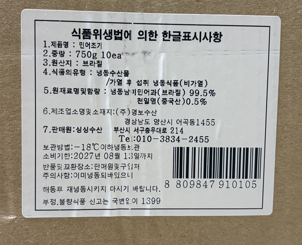 | 품목 또는 명칭 | 냉동 민어조기 5미 750g/브라질 |