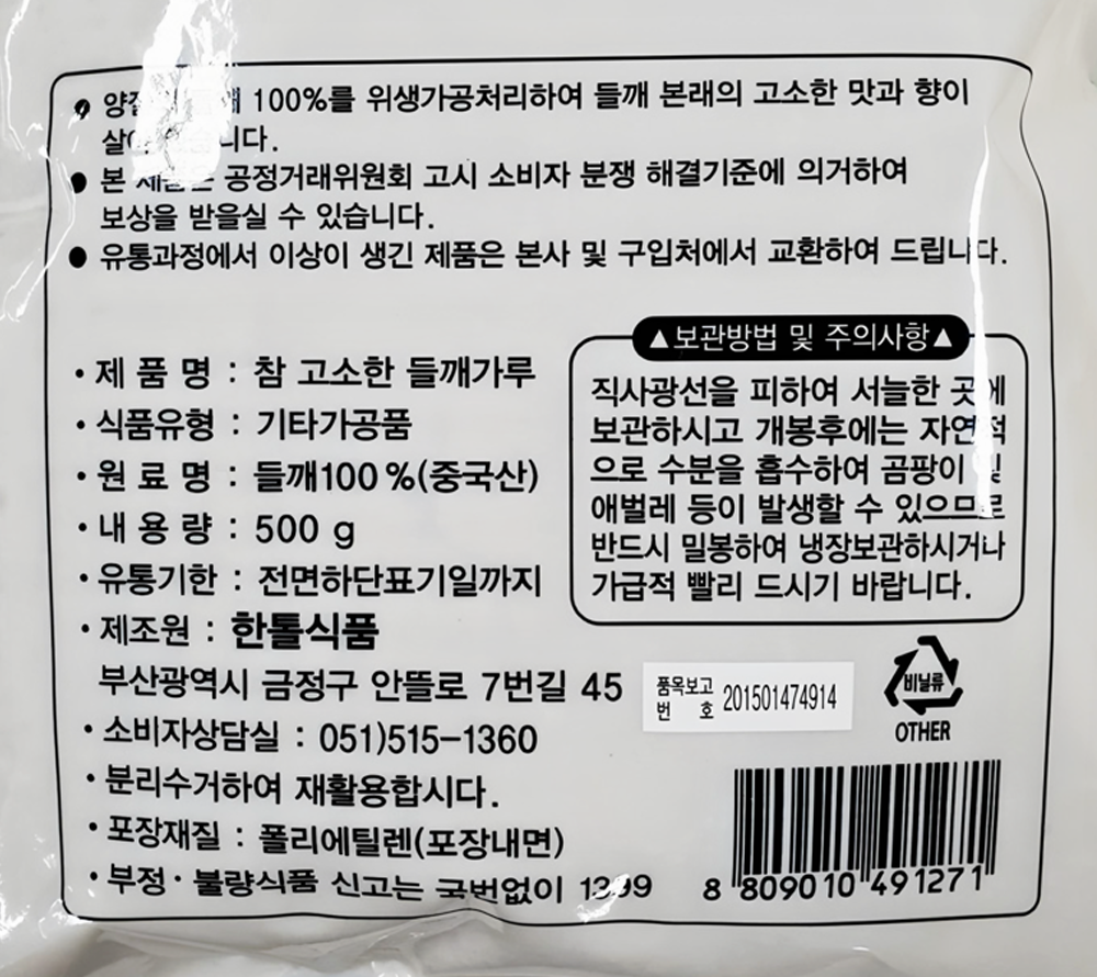| 제품명 | 참고소한 들깨가루 500g(중국산)/한톨식품 |