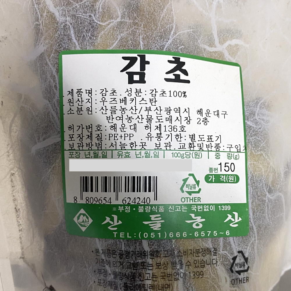 | 품목 또는 명칭 | 감초·150g(우즈베키스탄)/산들농산 |