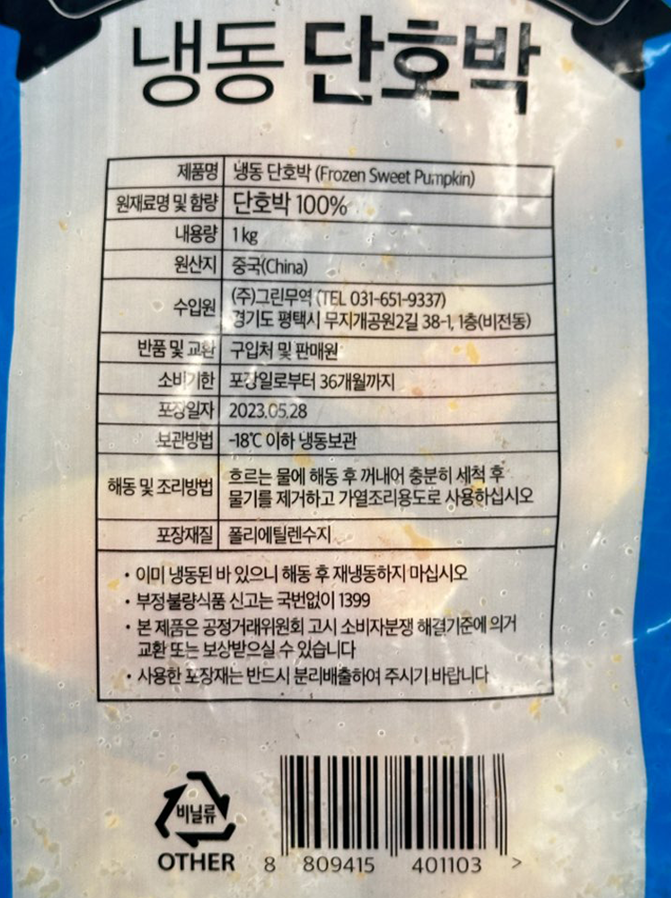 | 품목 또는 명칭 | 냉동 단호박(탈피)·1kg/중국산 |