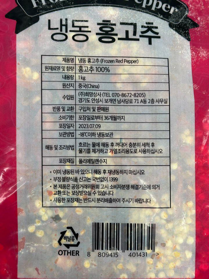 | 품목 또는 명칭 | 냉동 홍고추·1kg /중국산 |