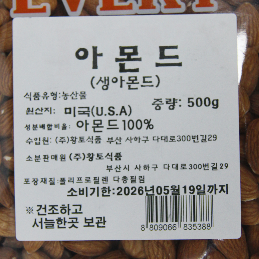| 제품명 | 생아몬드(무염) 500g/황토식품 |