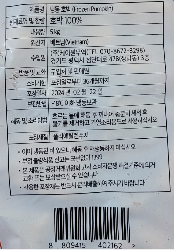 | 품목 또는 명칭 | 냉동 호박 5kg/베트남산 (탈피.죽용) |
