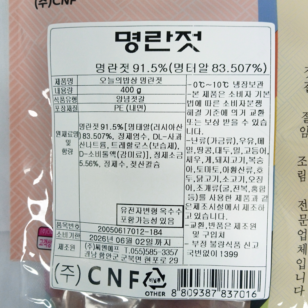 | 제품명 | 오늘의밥상 명란젓 400g/씨엔에프 |