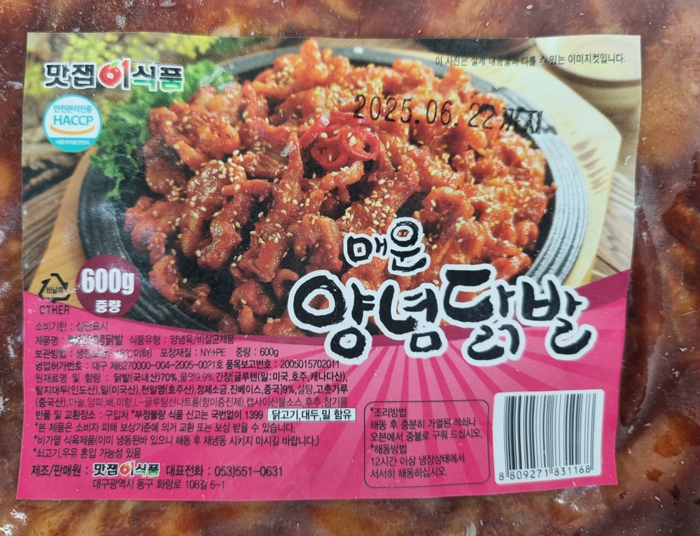 | 원재료명 및 함량(농수산물의 원산지 표시에 관한 법률에 따른 원산지 표시 포함) | 닭발(국내산)70%,물엿9.9%,간장,탈지대두,밀,천일염,설탕,고춧가루,마늘,양파,배,미향,캡사이신불소스,후츠,참기름 |