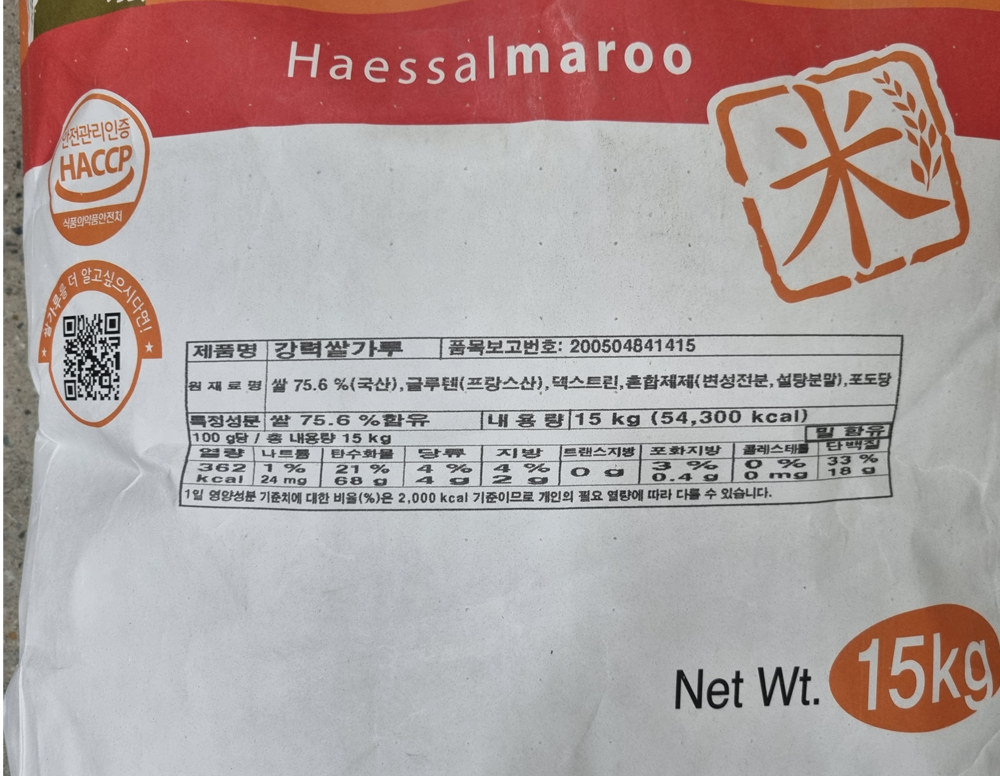 | 제품명 | 햇쌀마루 강력쌀가루 15kg/대두식품 |
