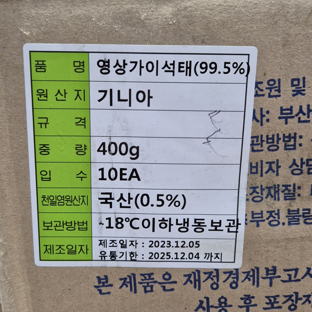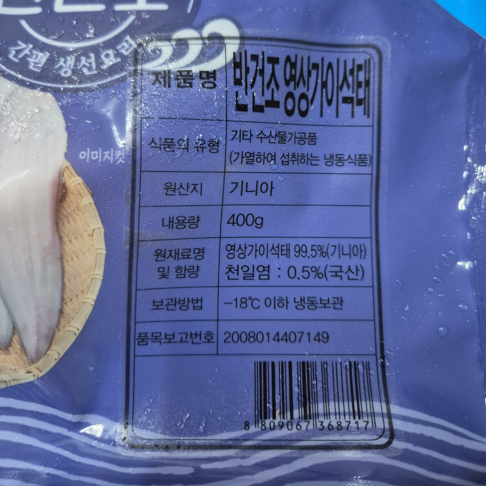 | 품목 또는 명칭 | 반건조 영상가이석태 400g(냉동)/기니아 |